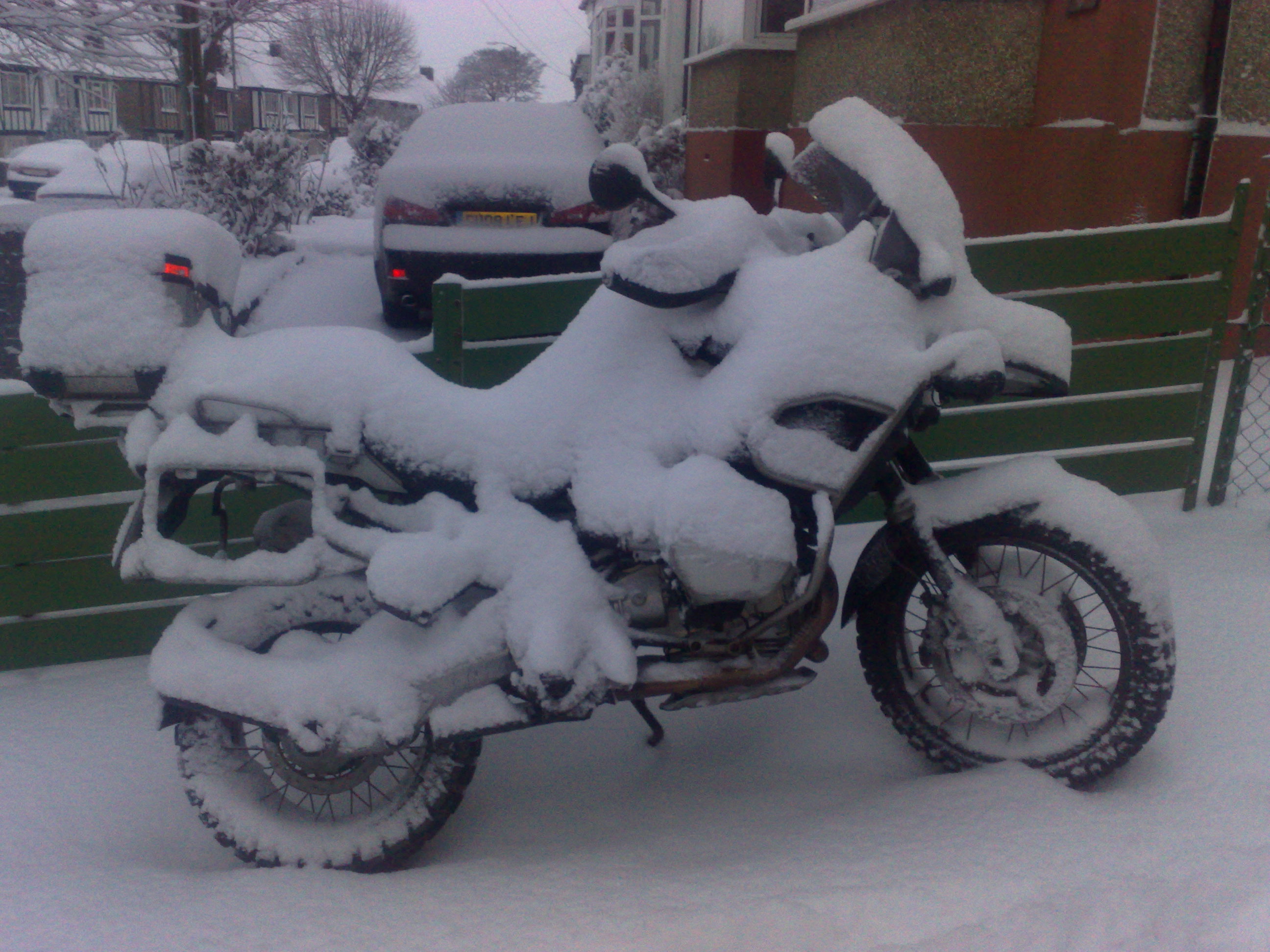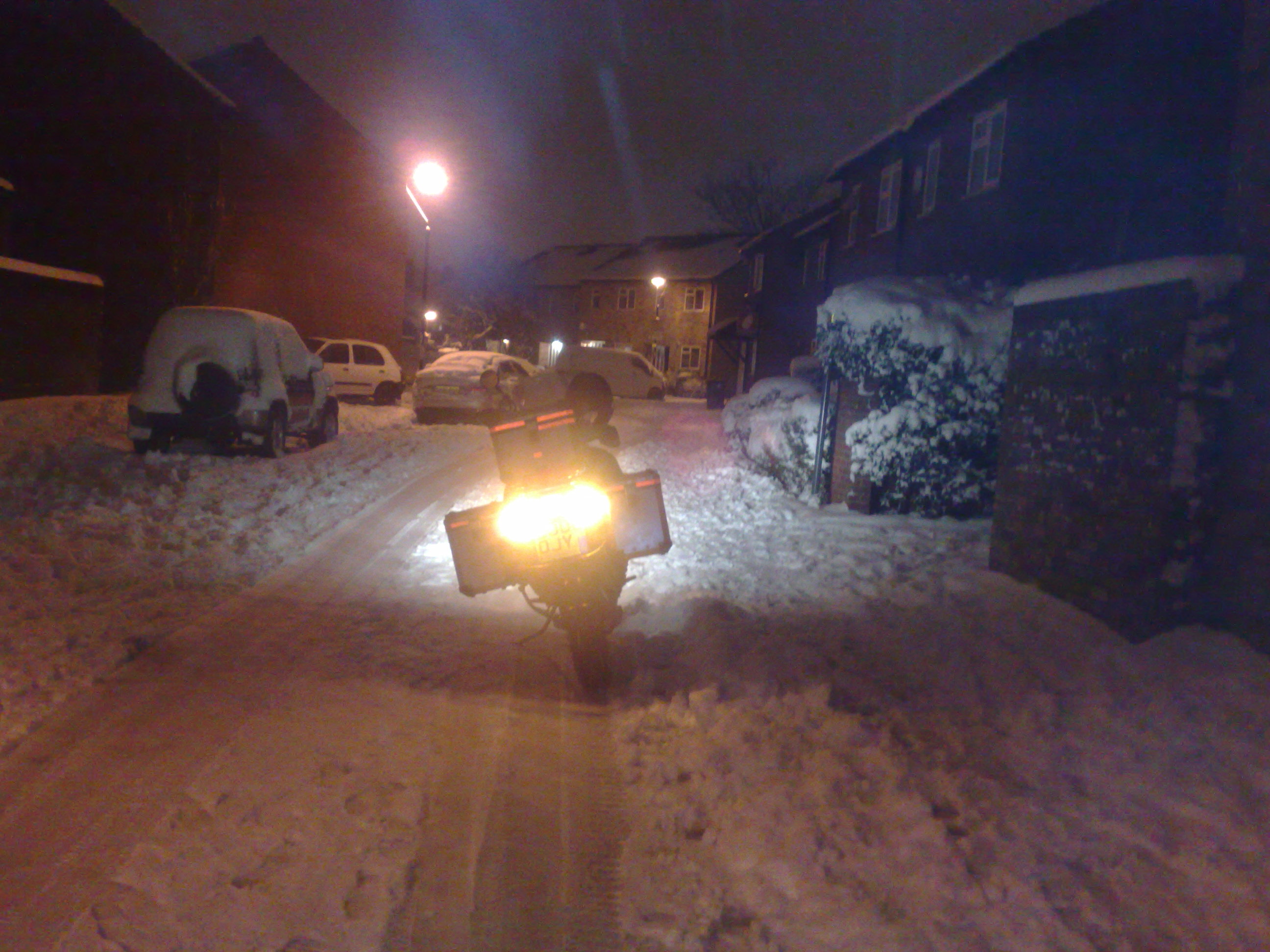 The weather in England was snowing heavily on Monday 02 of February 2009. My motorbike looks like this: I was suppose to come to London, Anna and me intended to stay in Travelodge near Luton to get to the airport in time (the flight at 10AM). Anna already gave up and is was almost canceled!